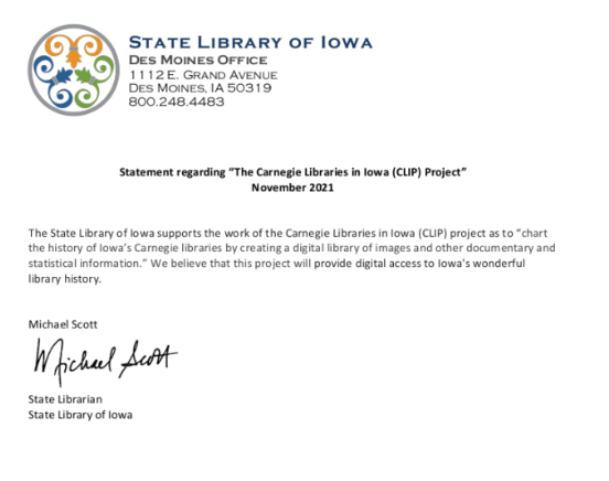 Since the fall of 2016, the State Historical Society, Inc., has provided funding that has allowed for substantial expansion of the CLIP website and processing of the digital archival materials. In 2024, the Carnegie Libraries in Iowa Project moved to Cornell College. In addition, CLIP’s mission is supported by the State Library of Iowa.