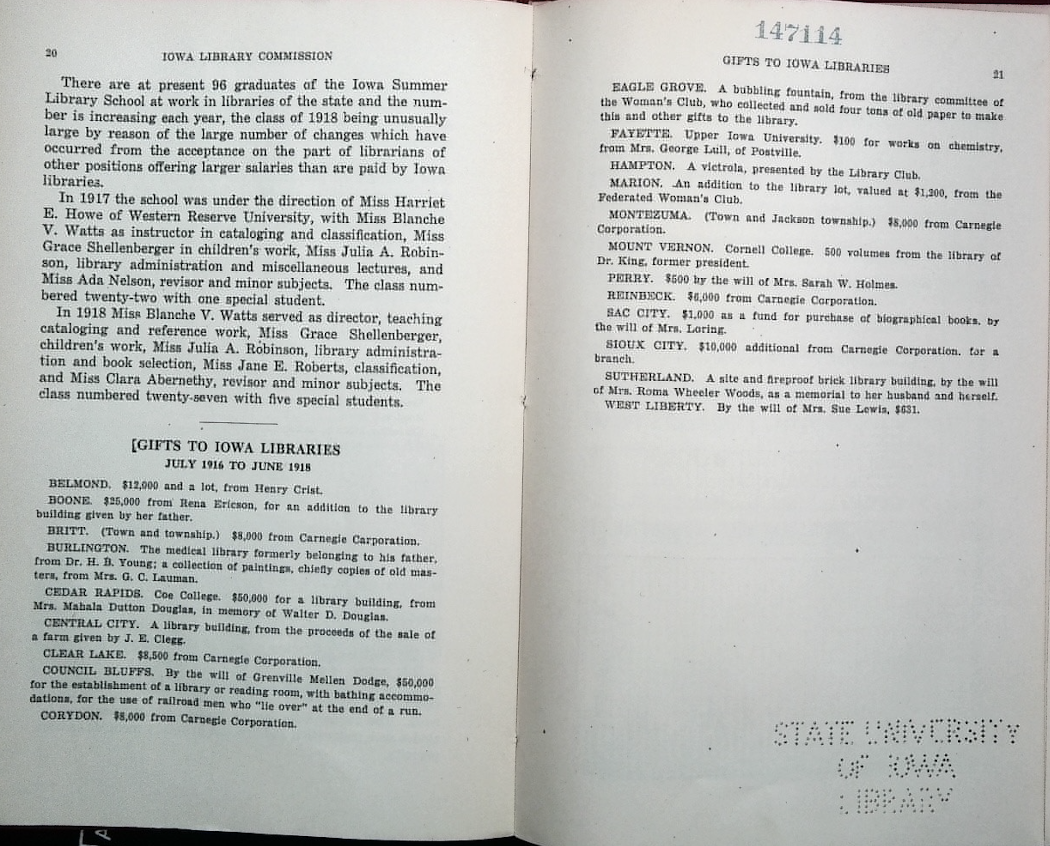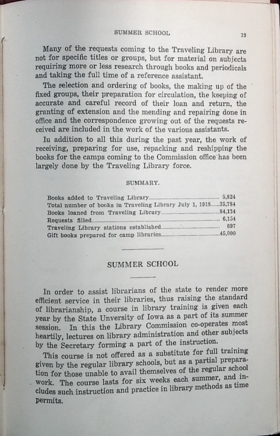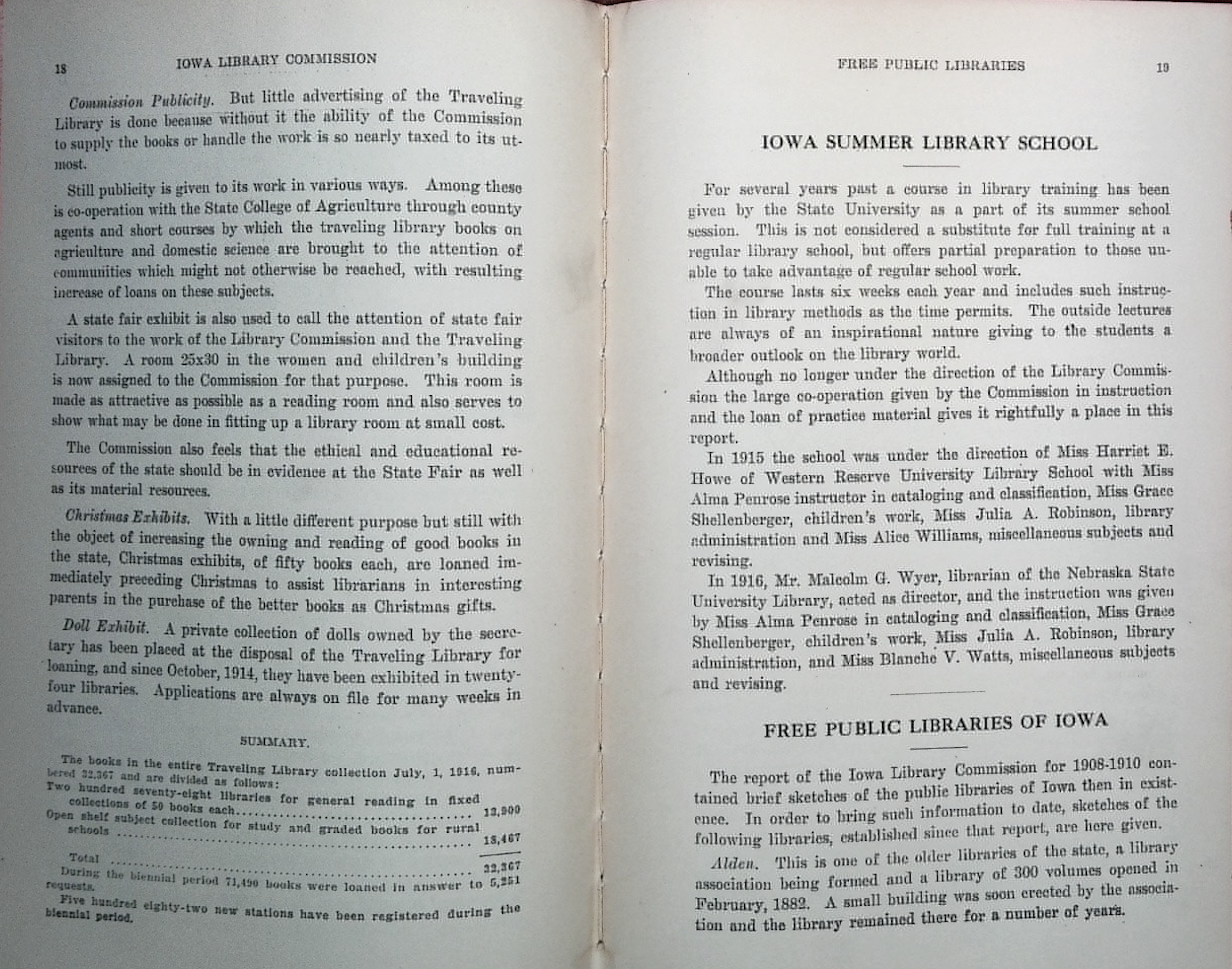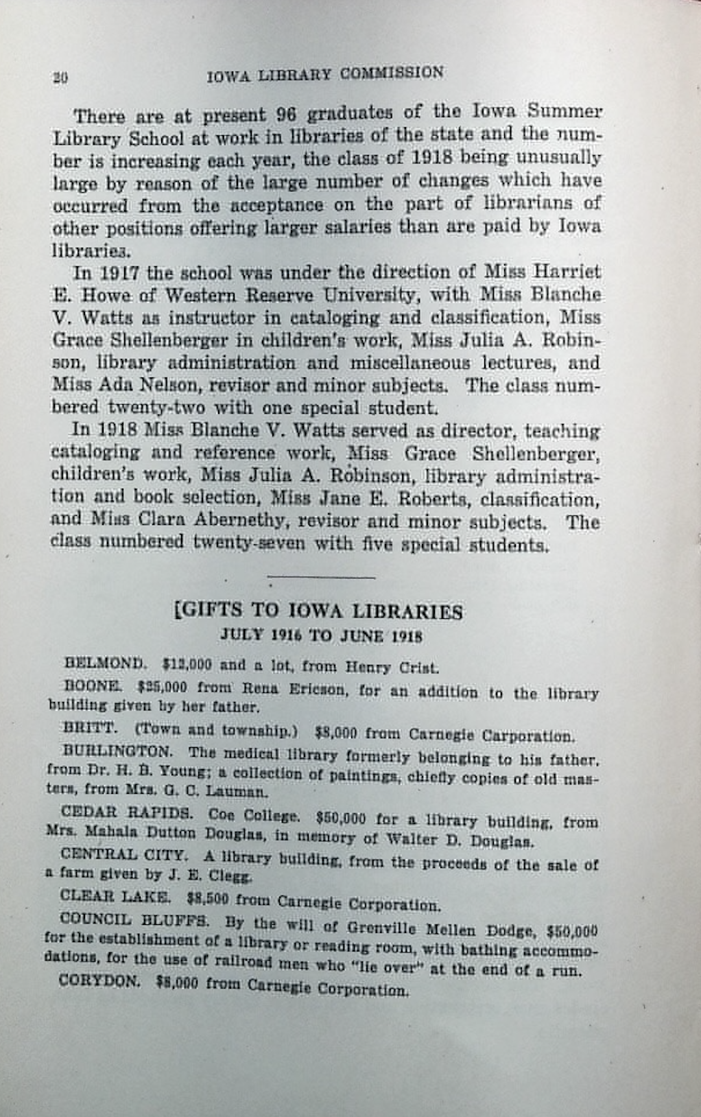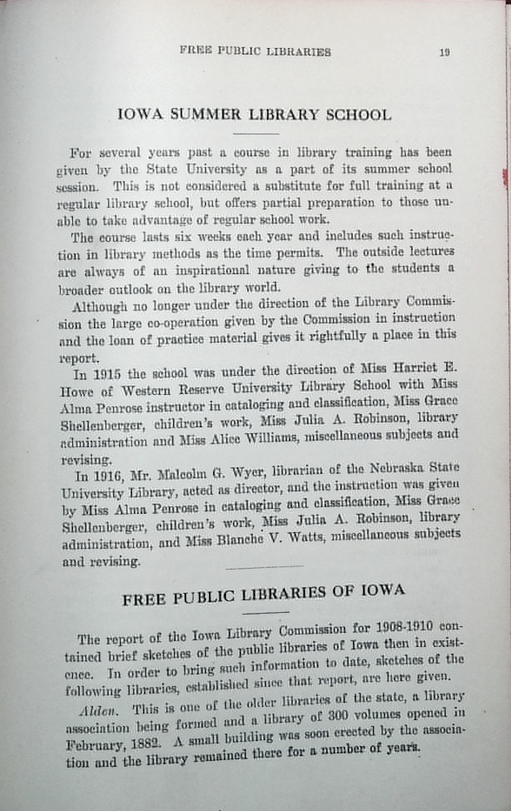 When she left Humboldt College she attended the Library Training School at the Carnegie Library in Pittsburgh, PA. Then she returned to Iowa and spent six years as a librarian at the Des Moines Public Library. For two years she was librarian for the board of control of state institutions. Miss Shellenberger had a special assignment of war work, having charge of the library at Fort Des Moines. She then spent a year as the librarian at Kewanee, Illinios, and then accepted the position of Librarian in the Davenport Public Schools in 1920. She served there for eleven years.
